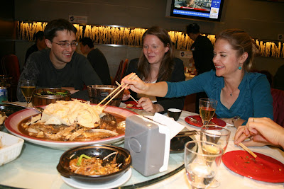 Essen: Da meine Leser ja sicher noch alle mit den Baozi von gestern beschäftigt sind, mal wieder was, wofür man vorbeikommen muss: Riesenfischkopf. 4.5 kg nur der Kopf, in einer scharfen Suppe mit so einer Art Fladenbrot serviert. Sehr gut und überhaupt nicht mühsam - nur wo kommen diese Köpfe her - und was geschieht mit dem Rest vom Fisch? Das in der Mitte ist übrigens der Fischkopf - sieht gar nicht so Fischkopfig aus...